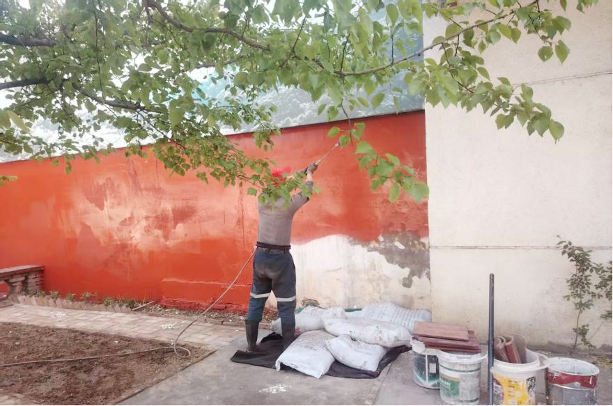 一大早,党员志愿者携带乳胶漆、喷枪、滚筒等工具集结到教育基地,有的负责墙面清理,用铲刀仔细铲除剥落的墙皮;有的负责调漆、搅拌,确保漆料染色均匀;有的手持滚刷、喷枪,认真粉刷每一处墙面;有的负责架起脚手架攀高作业,粉刷较高墙面……大家分工协作、配合默契、干劲十足。