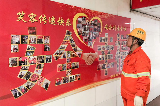 图为焦家寨矿副井文化长廊的“安全相片墙”,时刻警示职工下井时要注意安全。