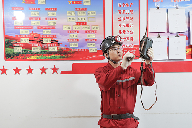 图为瓦炮队员工演示便携式光学瓦斯检测仪的操作流程。
