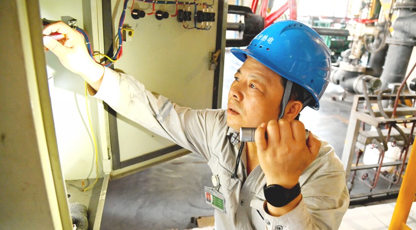 图为设备维护部电气检修人员对电源箱线路进行常规检查。