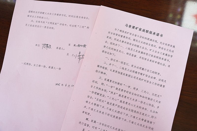 随后,两组家庭代表现场签订了《马脊梁矿家庭联保承诺书》。“主动学习安全知识,提升安全意识;在生活中多关心丈夫,留意其情绪变化;从家庭层面把好安全关,每日叮嘱丈夫安全注意事项,督促其遵守操作规程……”这份承载着家庭幸福的安全承诺书,字字句句是家属对亲人安全的郑重承诺,更是拉紧员工安全思想弦的有效举措。
