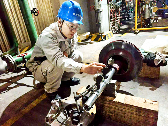 汽机检修区域,设备维护部青工王硕辉正在验收#3给水泵前置泵时,没有只停留在泵体表面的检查,而是一次次复测大轴弯曲度和探查推力瓦的工作状态。