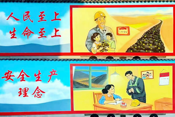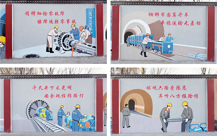 58米长的安全规范主题墙以图文并茂的形式,生动还原安全巡检、敲帮问顶、瓦斯监测、安全运输、隐患排查等作业场景,将枯燥的规章制度转化为直观易懂的视觉语言,直观传递安全规范作业的重要性;42米长的亲情主题墙面,则通过父辈传承、家庭团圆、矿山人荣光等温情画面,具象化呈现“安全是家庭幸福的基石”理念,以亲情力量唤醒职工安全自觉。此外,安全生产场景墙另一侧彩绘作品中还融入矿容矿貌变迁元素,全景展现了矿区和谐家园的整体风貌,让生态宜居的矿区新景与安全理念、亲情文化相映成趣。