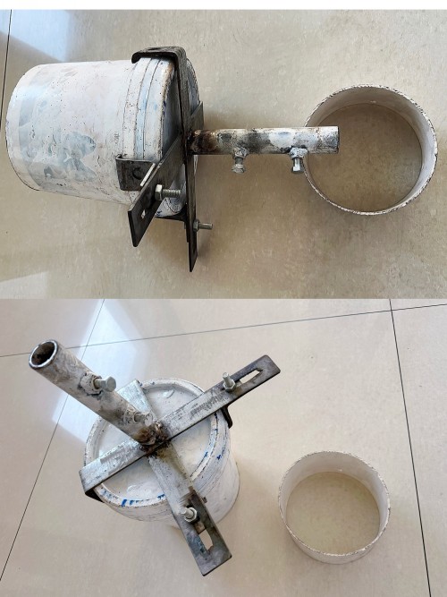 该装置主要采用废弃的截齿桶或其它塑料桶改装而成,取材较易、成本较低,且技术人员只需在截齿桶或塑料桶下方加装一个固定装置和伸缩杆便可使用,操作起来方便、简单。