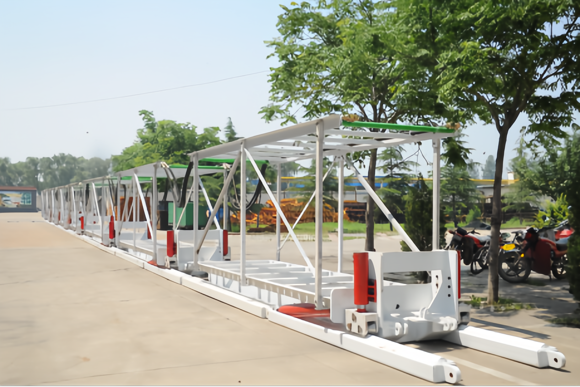 新的电气列车系统用若干相连的滑靴式平板车作列车底板,在底部与平板车一一对应地布置着导向推移梁,导向推移梁的后面分别竖向放置抬底千斤顶、横向放置推移千斤顶,乳化液泵站提供压力使抬底千斤顶和推移千斤顶的活塞杆做伸缩运动,整套电气列车系统在液压千斤顶的推拉力中实现高效移动。该项液压自移滑靴式电气列车有效解决了原先电气列车跑车、掉道及频繁铺设、拆除轨道的问题,消除了事故隐患,实现安全生产,该套设备节约了综合成本214万,真正做到安全性和经济性的统一,目前,已在长平公司所有综采工作面投入使用。