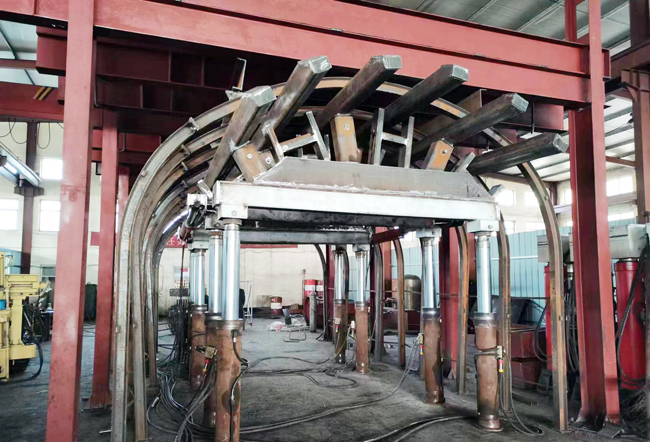 该装置是一种顶梁与支柱结合在一起,以液压为动力,依靠前后(或左右、内外)顶梁互为导向前移动的拱形巷道临时支护装置。支架整体由两个独立的支架交错连接而成。独立支架分别由4个立柱油缸、2个横梁、3个纵梁、4根推移油缸、及操纵阀组、油管等组成,通过推移油缸和两支架互为支撑来实现自移行走。并利用井下的乳化液泵站作为动力源,采用先进的滑移式设计,根据巷道曲率进行自适应调整,整体结构紧凑、合理、操作方便。同时,该装置采用高强度材料制造,具有良好的承载能力和稳定性。