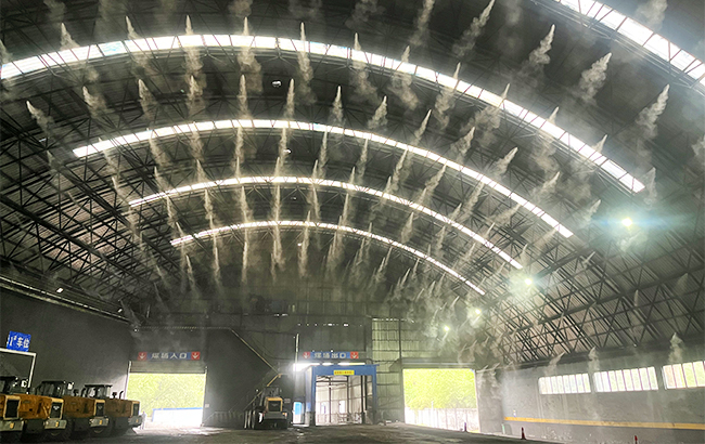 全断面喷雾降尘设备主要由高压喷淋主机、管道、降尘专用喷淋嘴组成,另有水处理装置可以过滤水中杂质,避免喷头堵塞。此次新设备引进,在储煤场棚顶正上方分9个区域共安装喷雾嘴3600多个,采取直角向下喷射方式,集抑尘与降温功能于一体,煤尘在上升过程中与经由喷嘴雾化后形成的密集水雾相结合,从而增加重量自然下落,达到降尘抑尘效果。此外,雾粒微小易蒸发,可以对封闭的储煤场起到降温作用。