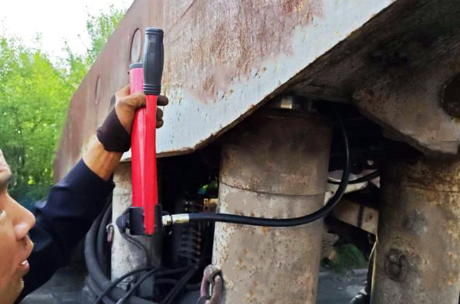 为此,该矿综采队根据应用场景,创新设计了快速取销装置。该套装置包括:长短顶杆、底座衬铁、楔铁、导向杆、分离式千斤顶、承压锁头、加压泵等。使用时通过现场液枪或乳化液泵站向加压泵提供动力,经过分离式千斤顶增大杠杆一侧的受力,使其受力点的锁头受力瞬间达到98KN,便于取下支架卡死的销轴。