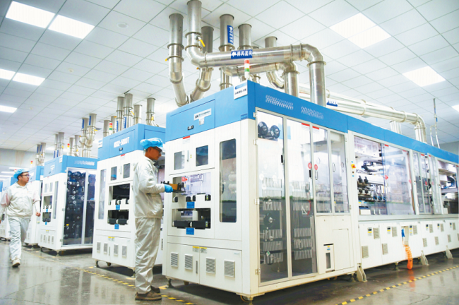 作为国内领先的光伏企业之一,潞安太阳能公司牢牢把握能源革命带来的新机遇,立足科技创新,积极布局拉晶、硅片、电池片、组件、电站开发等全产业链,同时不断推进高效率、高性能光伏产品研发生产,为全球客户提供更加优质的清洁能源解决方案,推动更多“潞安太阳能制造”产品走向世界舞台。图为高效组件生产车间串焊工艺段职工为设备放置材料。