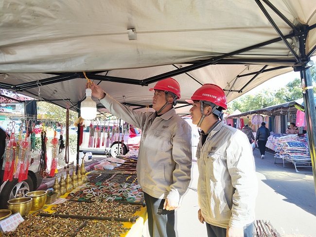 “这里来往人员较多,电线和插座放在地上不安全,得在边上找个地方固定一下。”“大姐,您这个插板要换个位置放,像这样靠近水桶是很危险的。”……查隐患、讲安全、送服务,每到一处,服务队都会提醒摊主规范停放电动自行车,不要私拉乱接电气线路,对摊主们的用电设施进行全面检查,并帮助摊主更换老旧设备、消除安全隐患。