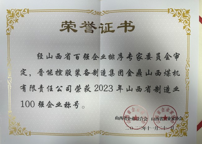 在11月21日召开的山西省企业联合会、山西省企业家协会2023山西企业100强发布会上,金鼎公司再度荣获“2023年山西省制造业100强”企业称号。