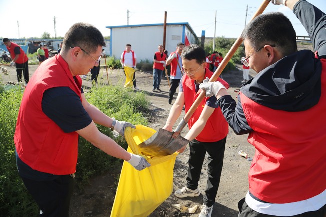 在该矿风井一侧,鲜艳的党旗和团旗迎风招展,在阳光的照耀下,熠熠生辉。党员突击队和团员青年志愿者挥汗如雨,一把把铁锹在他们手中上下翻舞、一个个规格一致的种植坑出现在他们身后。为了提升矿区绿化覆盖率,该矿每年都会开展绿化补种修复工作,分阶段、持续性投入绿化资金,对矿区和周边生态环境进行修复。同时,号召广大干部员工积极参与属地政府组织的义务植树造林和清脏治污活动,为驻地绿色生态做出力所能及的贡献,走出一条企地携手、合作共赢的绿色发展之路。