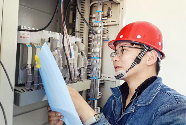 图为该项目技术人员正在核对交流屏外部电缆接线。