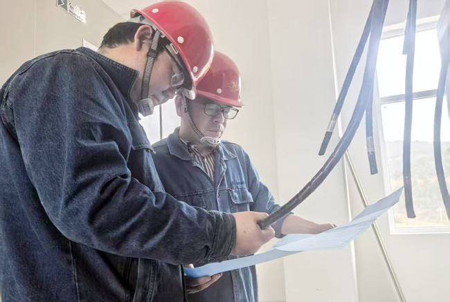 图为该项目工作人员正在检查敷设的控制电缆与图纸是否一致。
