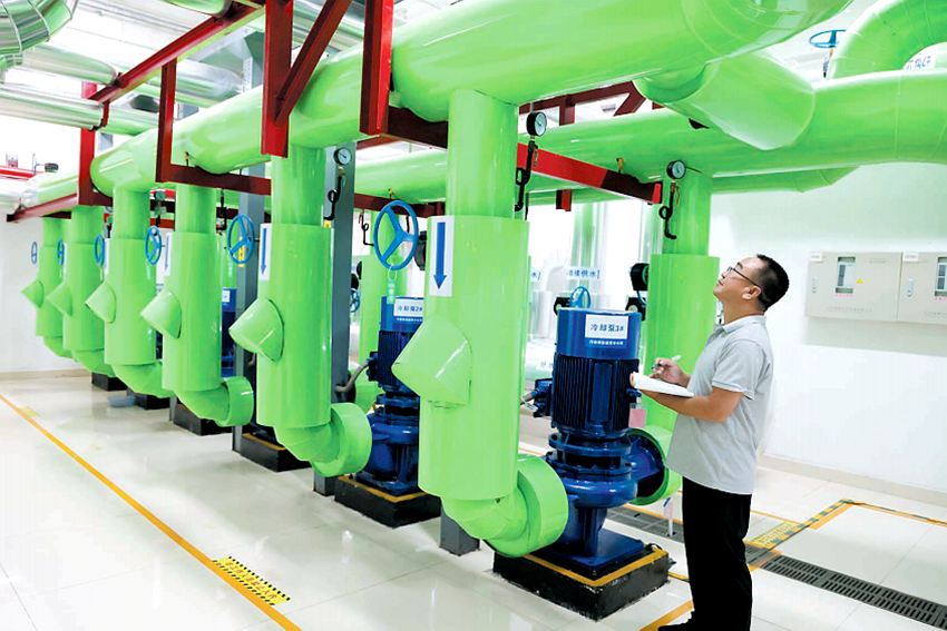 装备制造集团行政事务运营分公司深入开展标准化管理体系达标创建,全力推进安全生产标准化、岗位作业规范化、设备设施安全化、现场环境定置化,通过标准化建设驱动安全生产各项工作提质增效。该公司选定机关办公区域的科教楼空调机组间作为试点,对锈蚀管路进行除锈、刷漆、更换部件、粘贴标识等系统性修复,成功打造墙面平整、标识清晰、设备如新、环境整洁的标准化示范设备间。图为巡检人员在标准化空调机组间对运行中的设备进行巡检维护。