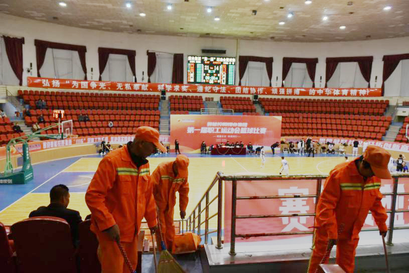 控股煤业集团第一届职工运动会篮球比赛开赛之际,场馆内外的保洁服务工作也在紧锣密鼓、有条不紊地进行着。
