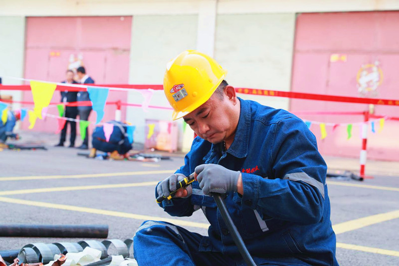 外线电工技术比武的选手们身着工作服、绝缘鞋,头戴安全帽,有条不紊完成10kV交联聚乙烯电缆户外冷缩终端头制作的每一个步骤,展现出了扎实的专业知识和丰富的实践经验。