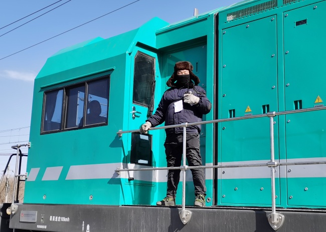 上午十点多,阳光普照站场,但气温仍在零下。调车人员穿着厚重的棉质工作服,戴着厚帆布手套,围脖拉到半脸高,呼出的气体在针织围脖外凝结成一阵阵“白雾”。机车牵引着十几节车辆驶出时,韩泽晋身上的计划单随风翻飞,发出呼啦啦的响声,与新能源机车微小的运行声交织在一起,仿佛在铁路站场上奏响了一曲保运交响乐。