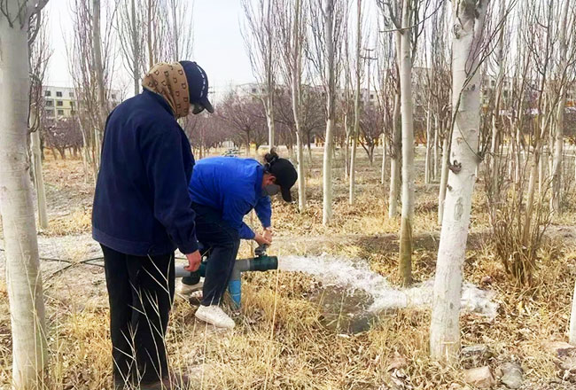 行政事务中心提前谋划、精心组织。工作人员对矿区主干道行道树、防风林带、住宅区绿化景观等区域进行系统勘查针对不同区域的植物特点和土壤情况,量身定制差异化灌溉方案。分别采用滴灌和漫灌的方式,既确保深层土壤渗透,又实现水资源高效利用,让每株苗木都能畅饮春水。