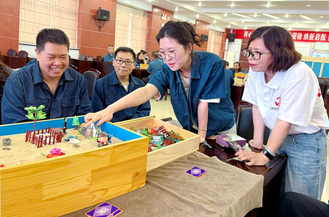 活动在温馨轻松的氛围中展开。授课老师以“亲密关系中的能力提升”为主题,创新采用沉浸式沙盘游戏深度体验与OH卡“卡牌叙事”相结合的方式,带领员工开启一场趣味十足的心灵探索之旅。在老师亲切而专业的引导下,员工们纷纷加入到沙盘游戏中。他们专注地挑选沙具,自由地摆放,将内心深处的潜意识投射到沙箱中。在OH卡“卡牌叙事”环节,教师用一张张小图卡、一句句简单引导,为员工疗愈心灵,让员工逐步打开心扉,探索内心深处的情感与想法。教师凭借丰富的专业知识,对员工的沙盘作品和卡牌选择进行深入解读,帮助大家从心灵层面重新认识亲密关系,掌握处理关系的有效方法与技巧。
