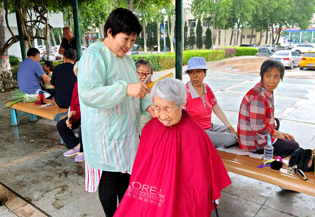 图为志愿者为居民义务理发。