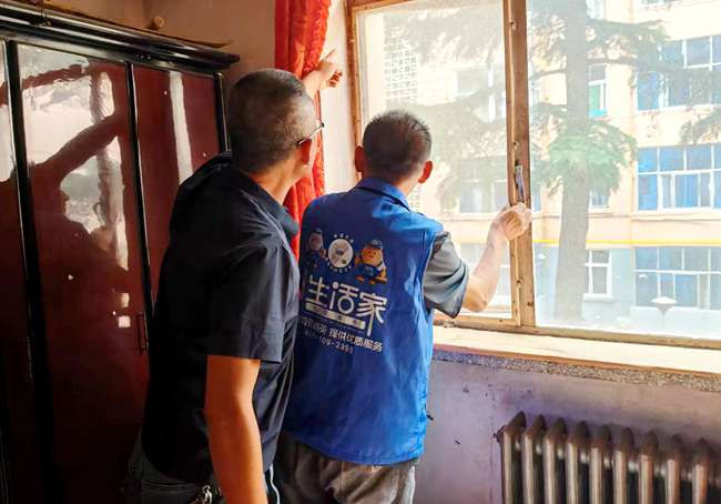 图为社区工作人员为独居老人更换破损窗纱。