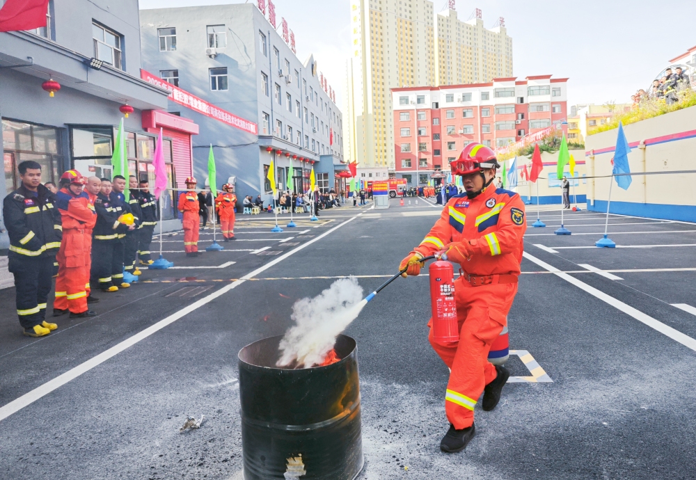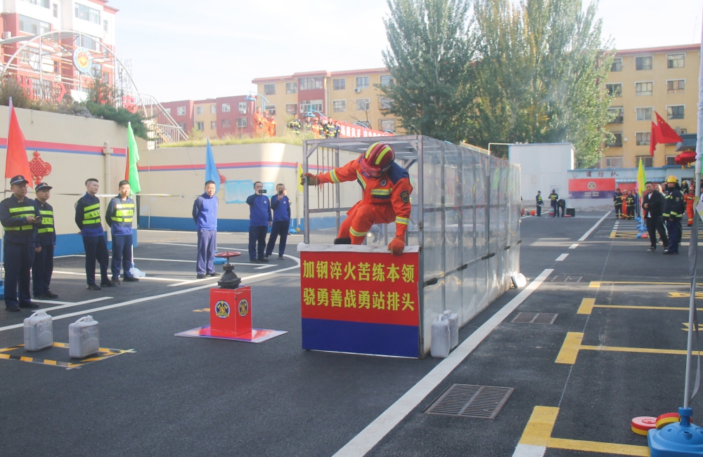 此次比武竞赛聚焦实战需求,科学设置个人与团体两大类别共3个竞赛项目,全方位考验消防员的综合业务能力。在单人160米综合救援操项目中,参赛消防员需连贯完成携带泡沫桶负重、关闭法兰阀门、携带液化气罐负重、干粉灭火器灭火、翻越障碍等一系列高难度动作。发令枪响的瞬间,消防员们如离弦之箭般冲出起点,动作干脆利落,每一次弯腰、每一次衔接都精准无误,展现出扎实的个人业务功底。