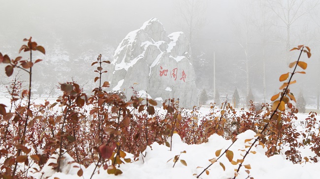 厂外,连绵起伏的山峦在雪的点缀下更显雄浑壮丽,万木银装。