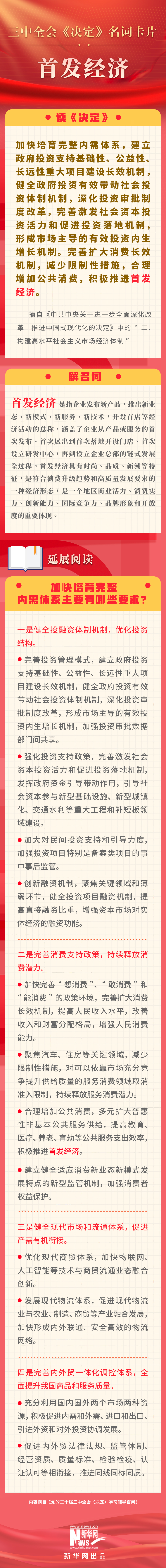党的二十届三中全会审议通过了《中共中央关于进一步全面深化改革、推进中国式现代化的决定》。新华网依据《党的二十届三中全会〈决定〉学习辅导百问》,制作三中全会《决定》系列名词卡片,和大家一起来深入学习领会二十届三中全会精神。本期名词是“首发经济”。
