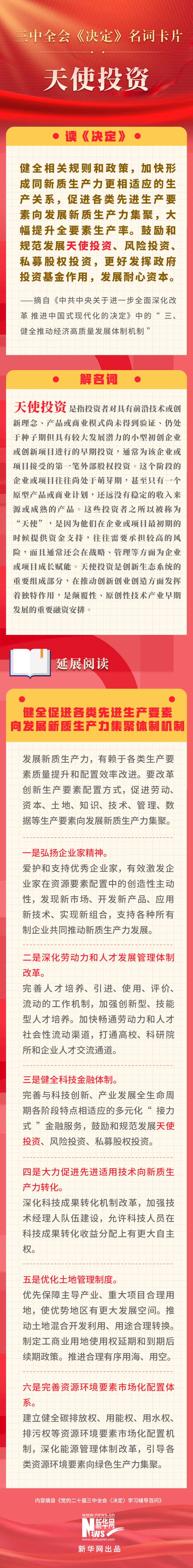 党的二十届三中全会审议通过了《中共中央关于进一步全面深化改革、推进中国式现代化的决定》。新华网依据《党的二十届三中全会〈决定〉学习辅导百问》,制作三中全会《决定》系列名词卡片,和大家一起来深入学习领会二十届三中全会精神。本期名词是“天使投资”。